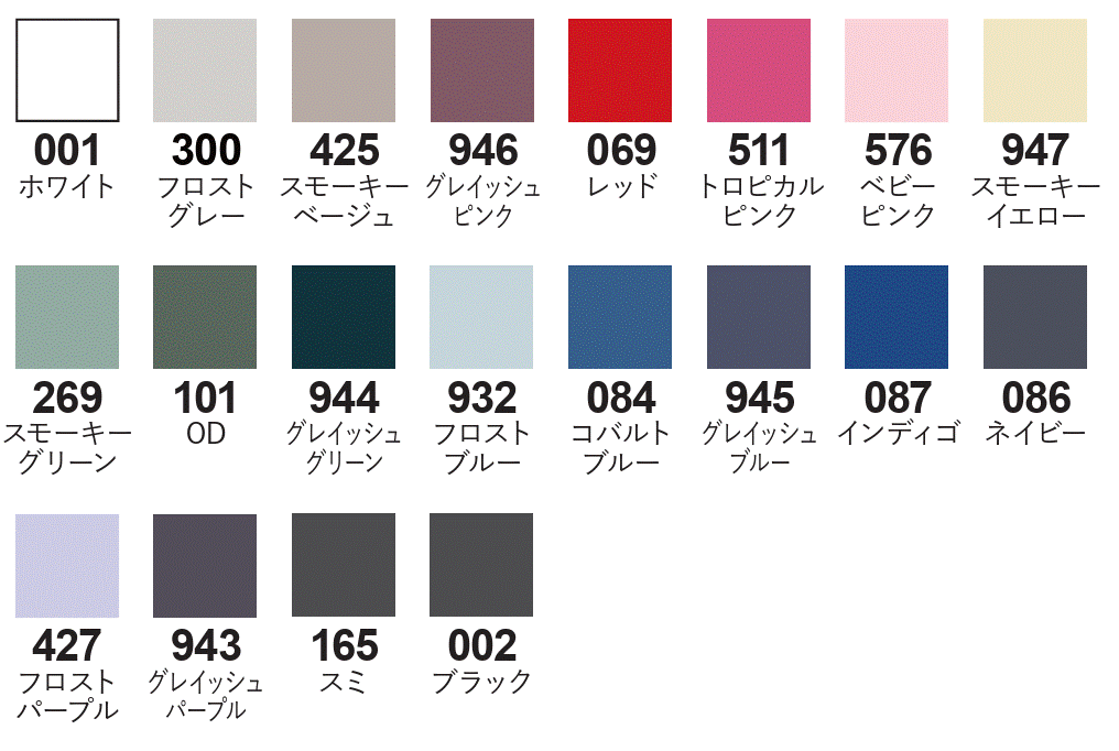 ※コバルトブルー・レッド・ネイビー・インディゴ・ブラック・OD・トロピカルピンクはカチオン可染ポリエステルを使用しています。
